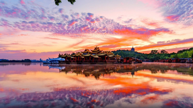 水天一色!杭州西湖龙船雷峰塔和朝霞同框浪漫唯美